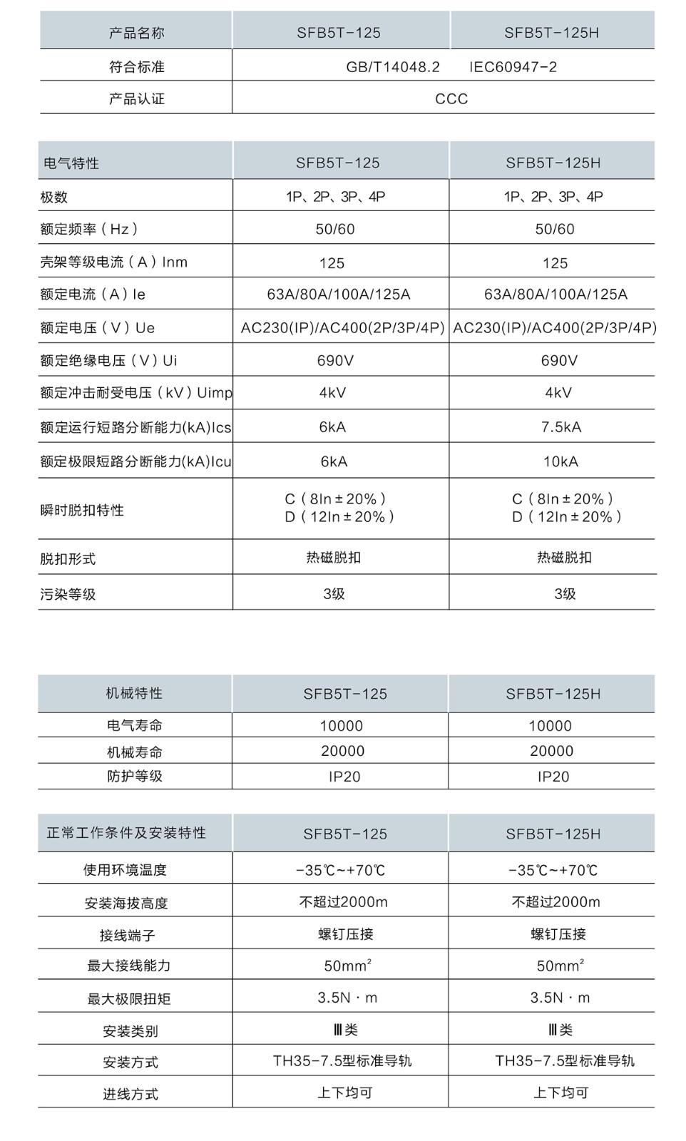 SFB5T-125系列斷路器(以下簡稱斷路嗣),主要用于交流50Hz,額定工作電壓230V/400V,額定電流至125A及以下。額定極限短路分斷能力不超過1000OA的配電線路中,作為過載、短路保護用,亦可作為線路不頻繁通斷操作與轉換之用。本斷路器主要用于工業、商業、高層建筑和民用住宅等各種場所。