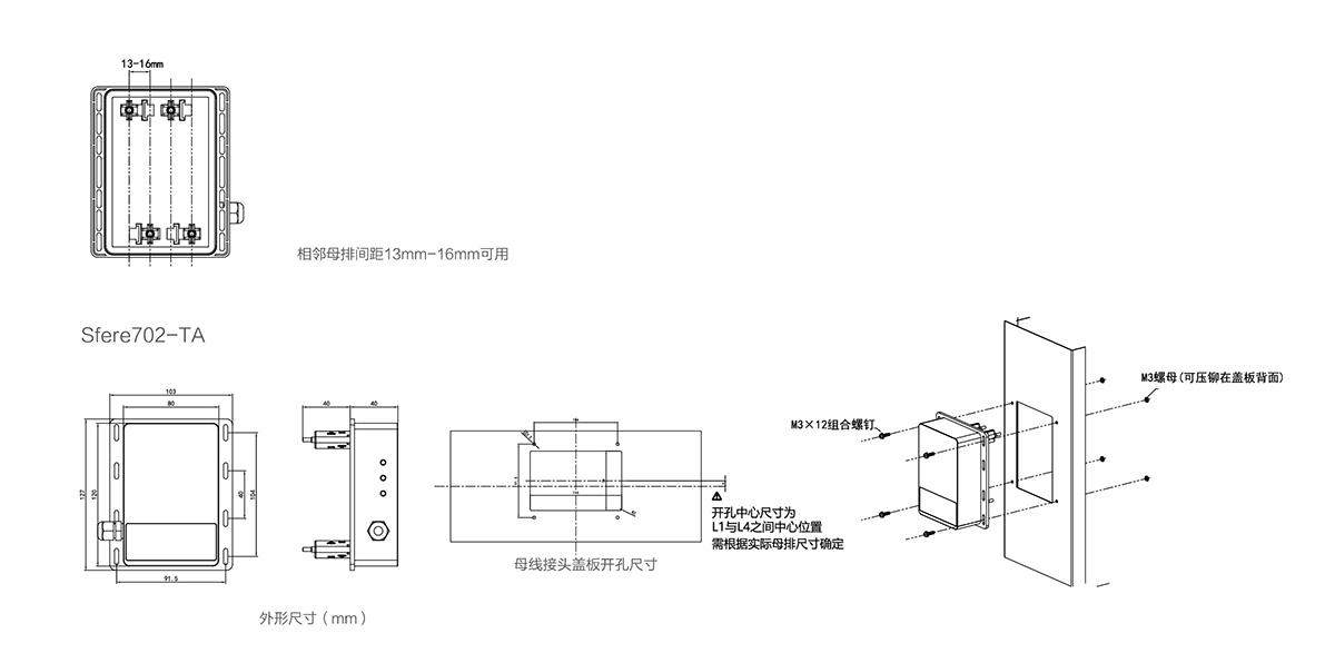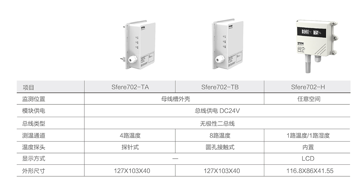 Sfere702母線槽溫度監控系統由監控主機,溫濕度采集模塊構成,用于低壓密集母線槽溫度監測,主要監測的溫度包括:母線槽連接處的溫度(每相接觸點的溫度)、母線槽外殼溫度、環境溫度等,并能夠在監控單元中進行數據的顯示、上傳、存儲和故障報警。