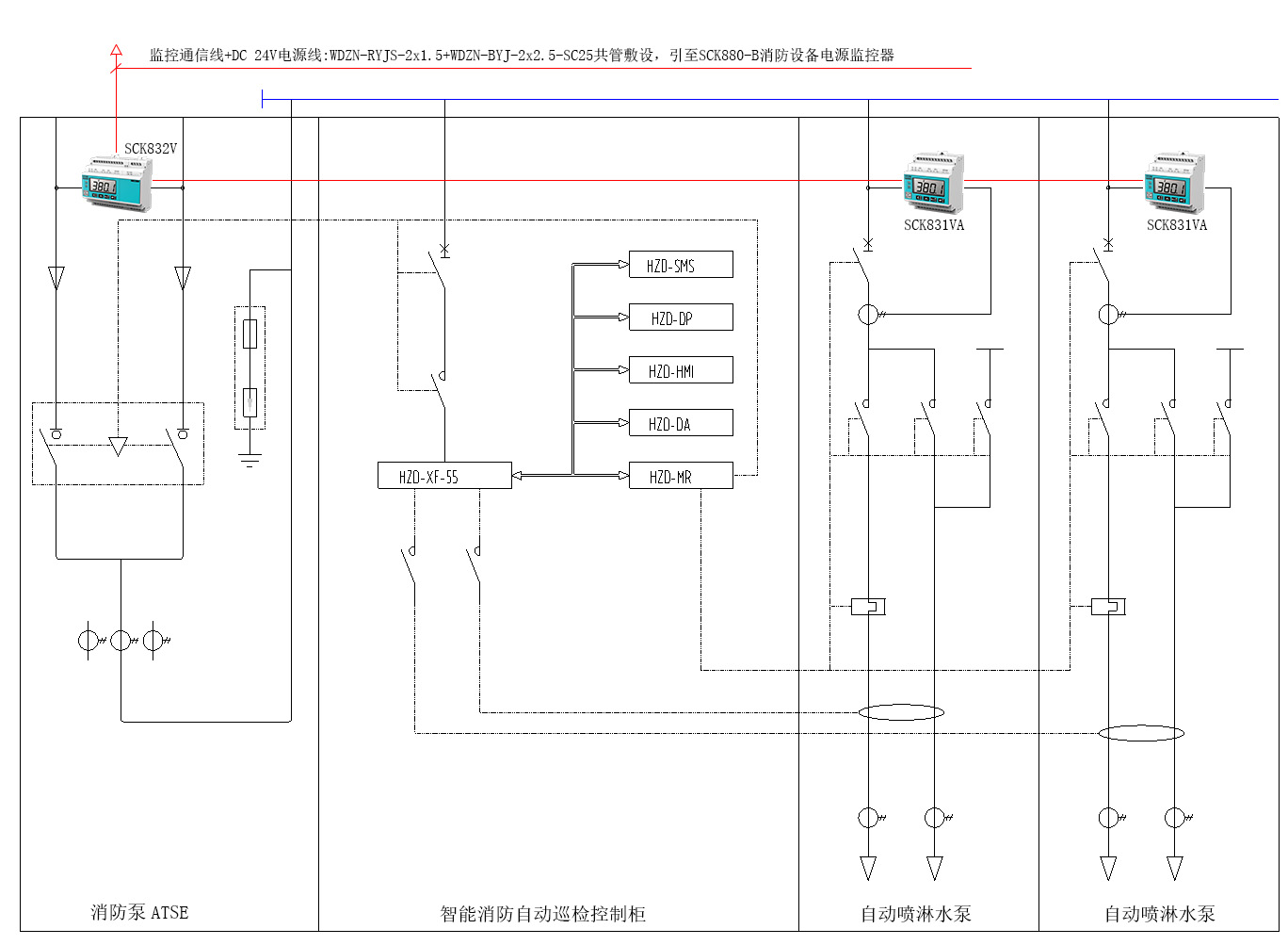消防泵房配置方案消防泵房一般設置于地下,是放置消防泵的設備房,包括消火泵、噴淋泵和其他消防用泵。消防泵屬于重要的滅火設備,因此需要對各消防泵的電源及工作狀態做全面監控。建議在進線處安裝一臺SCK832V電壓信號傳感器,對雙電源電壓進行監測,出線回路各安裝一臺SCK831VA電壓/電流信號傳感器,對出線電流、電壓進行監測。