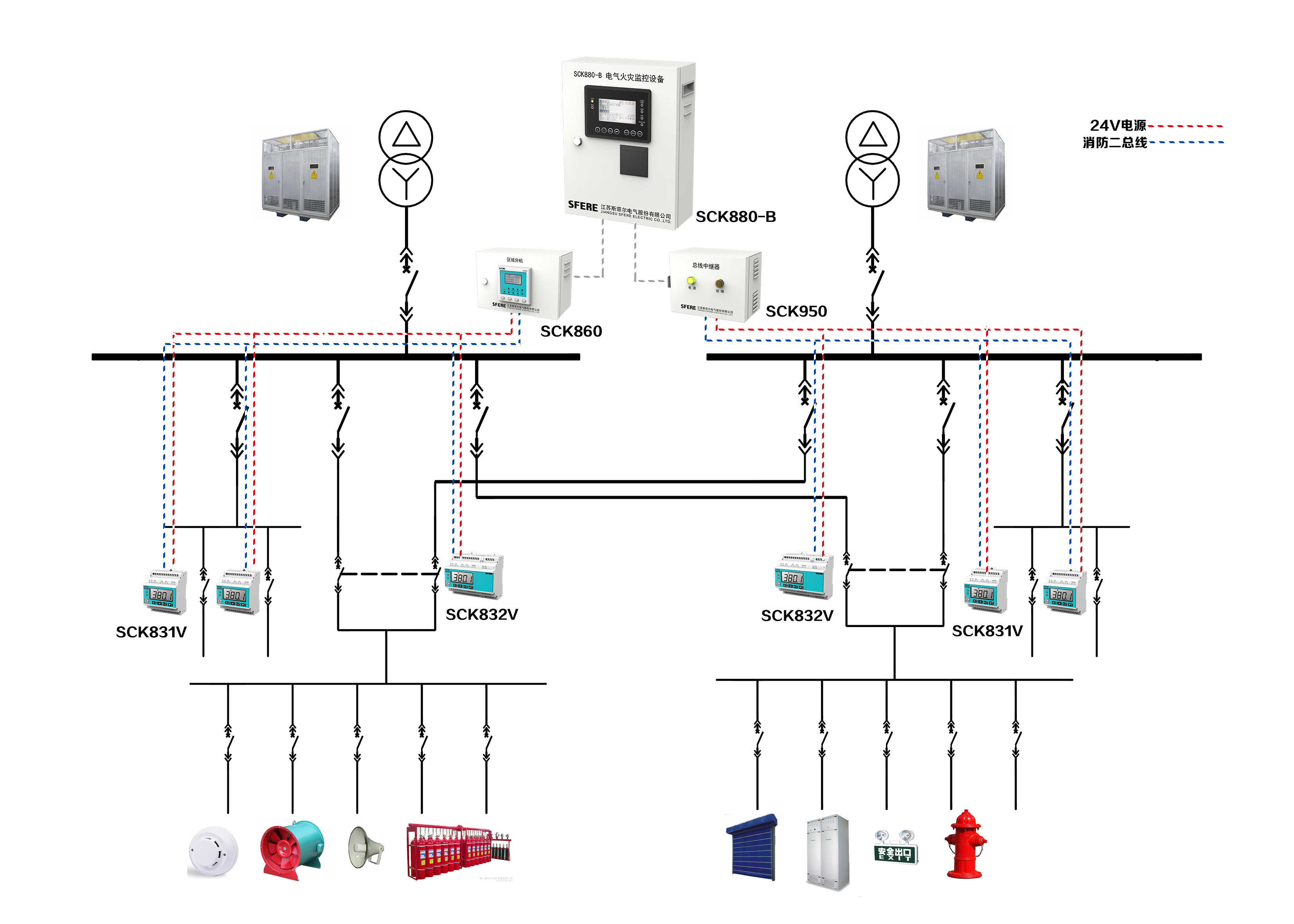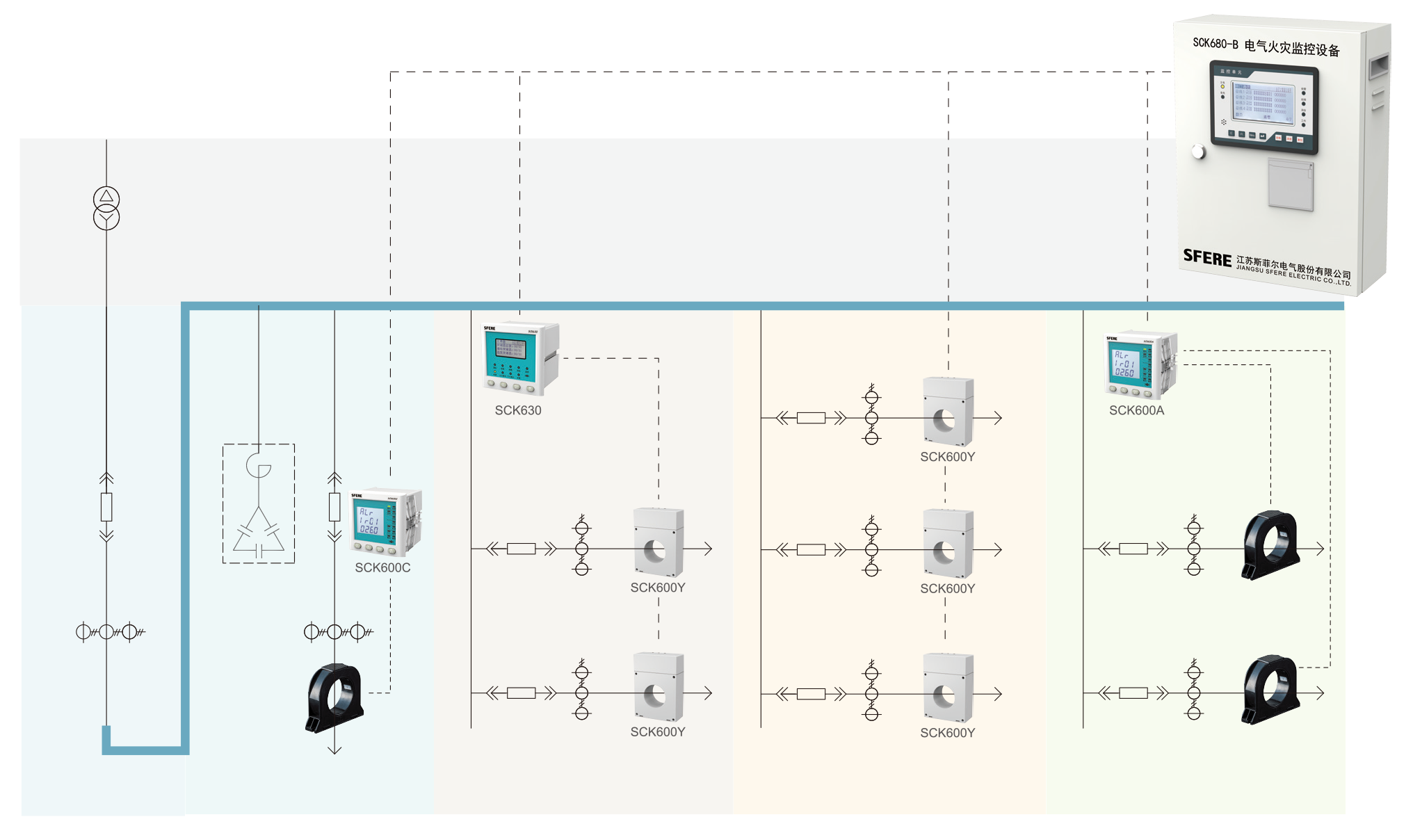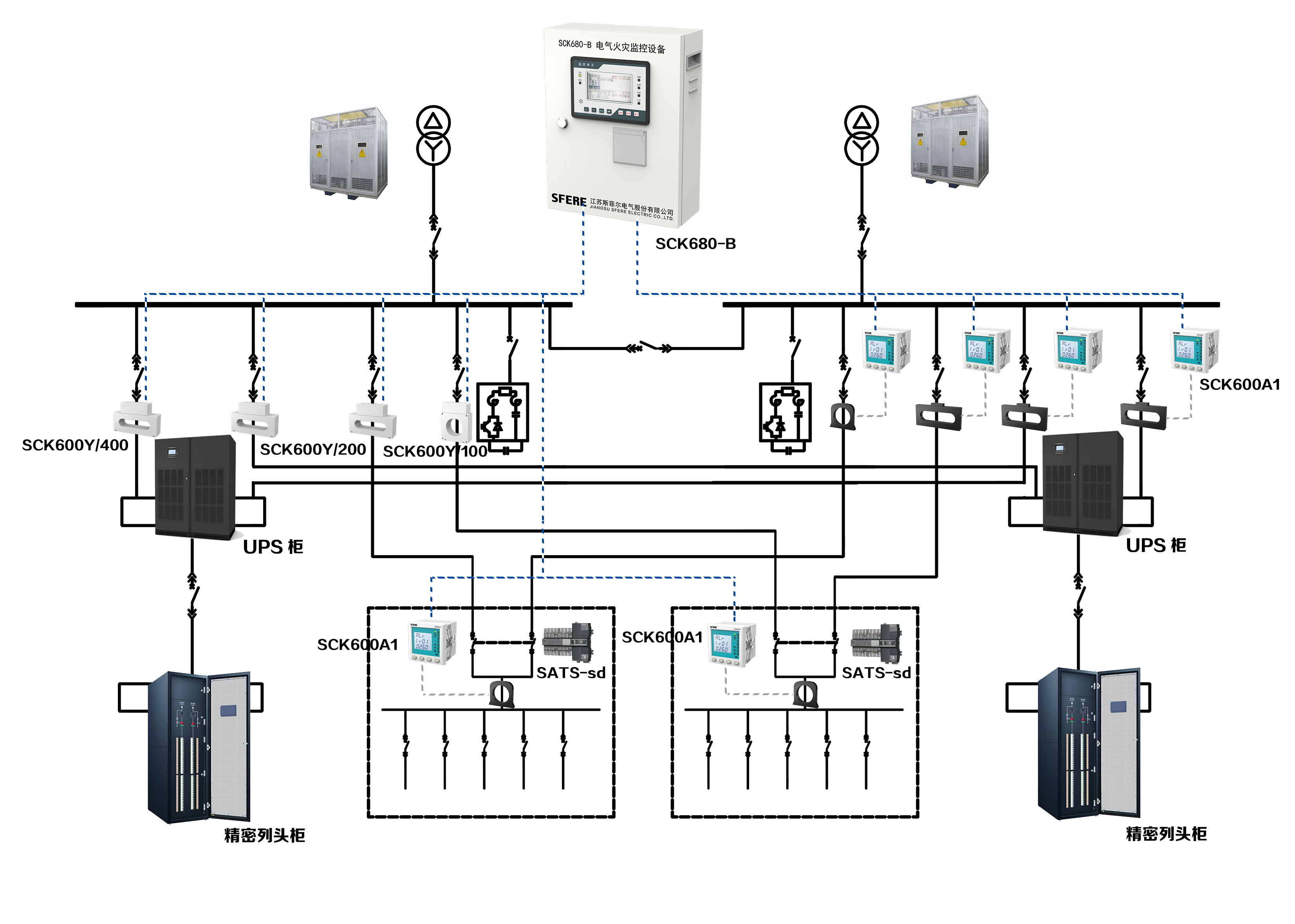 場景及功能描述在數(shù)據(jù)中心內,SCK600電氣火災監(jiān)控系統(tǒng)可安裝于TN-S、TN-C-S以及局部TT低壓配電系統(tǒng)中,系統(tǒng)包含SCK680電氣火災監(jiān)控設備、SCK600電氣火災監(jiān)控探測器以及剩余電流互感器、溫度傳感器等附件。電氣火災探測器用于監(jiān)測回路中剩余電流、負荷電流、電纜溫度等參數(shù),同時上傳至監(jiān)控設備實現(xiàn)集中控制和集中管理;當回路中相關參數(shù)異常時,監(jiān)控設備發(fā)生聲光報警,指示報警部位,同時現(xiàn)場探測器發(fā)出聲光報警和控制信號,提醒用戶對隱患線路進行排查或者更換,降低由于電氣原因造成火災的風險。