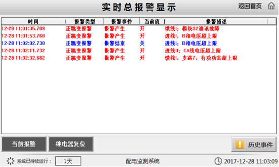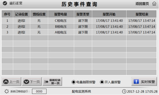 查詢電量越限報警記錄,顯示歷史報警信息,詳細記錄報警電量、報警類型及報警起始時間,通過查詢歷史事件可追溯報警時運行線路的狀態。查詢開入報警記錄,顯示開關量報警信息。可詳細記錄饋線位置、報警電量、開關狀態及動作時間。