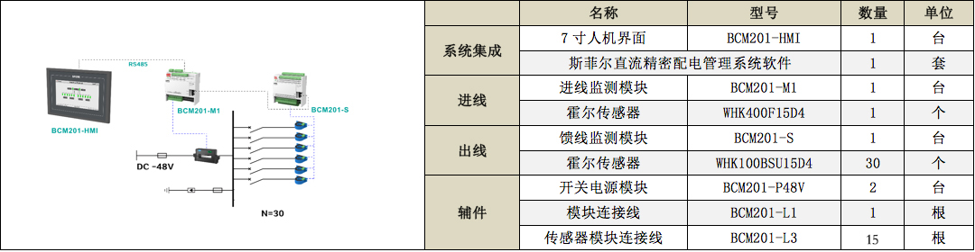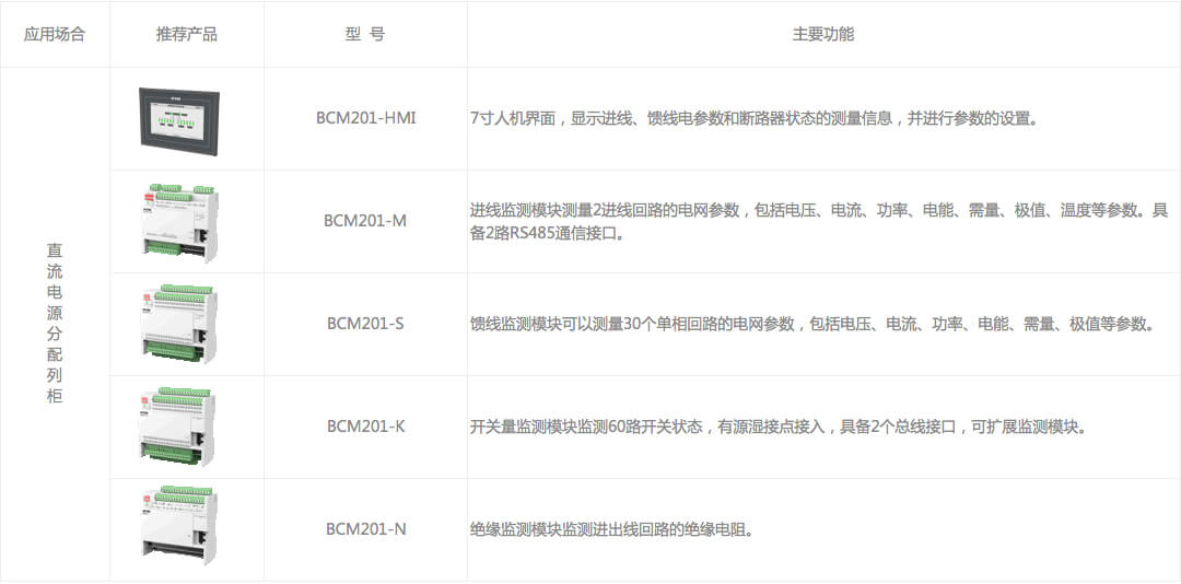 進線回路采用BCM201-M1模塊監測1路直流進線,出線回路配置一個BCM201-S監測模塊,實現對進線及各個出線回路的電壓、電流、有功功率、電能、極值、需量。