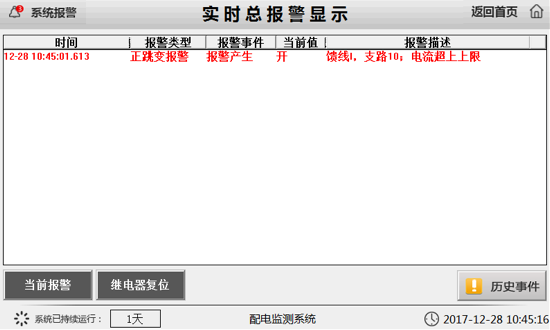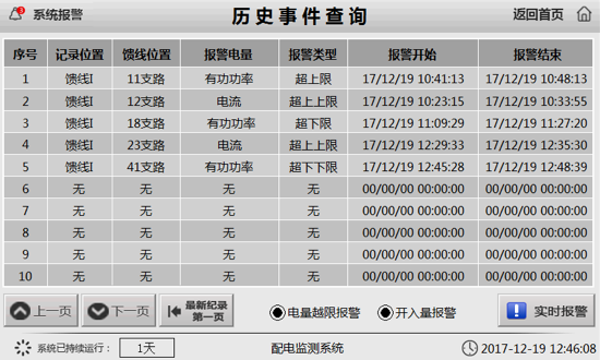 查詢電量越限報警記錄,顯示歷史報警信息;詳細記錄報警電量、報警類型及報警起始時間;通過查詢歷史事件可追溯報警時運行線路的狀態。