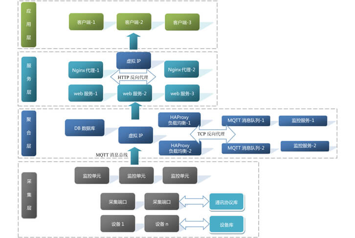 海量設備計入為避免低效的數據輪詢和大量冗余數據上傳至平臺,采用分布式監控單元在設備端進行本地數據采集、處理和上報,只上報變化數據和事件告警,減少平臺中心壓力。同時在平臺聚合成通過分布式消息總線分離數據請求,通過增加消息總線即可實現海量設備接入。
