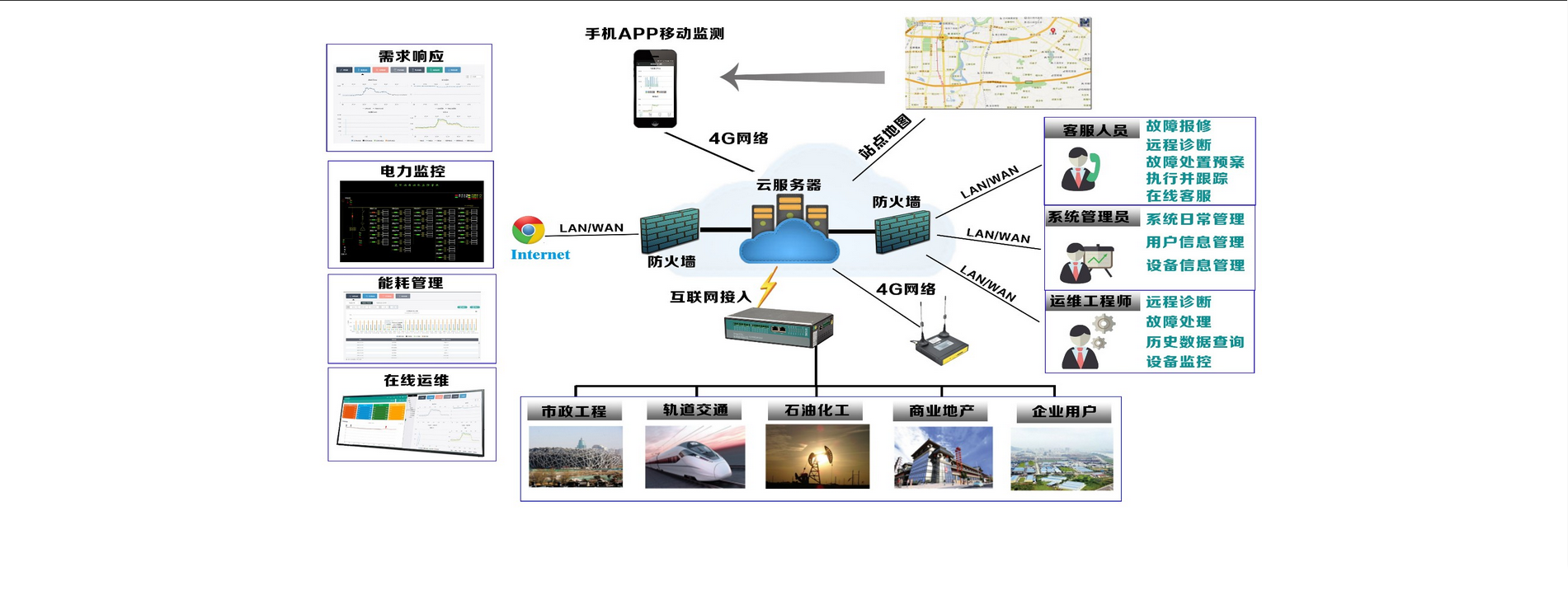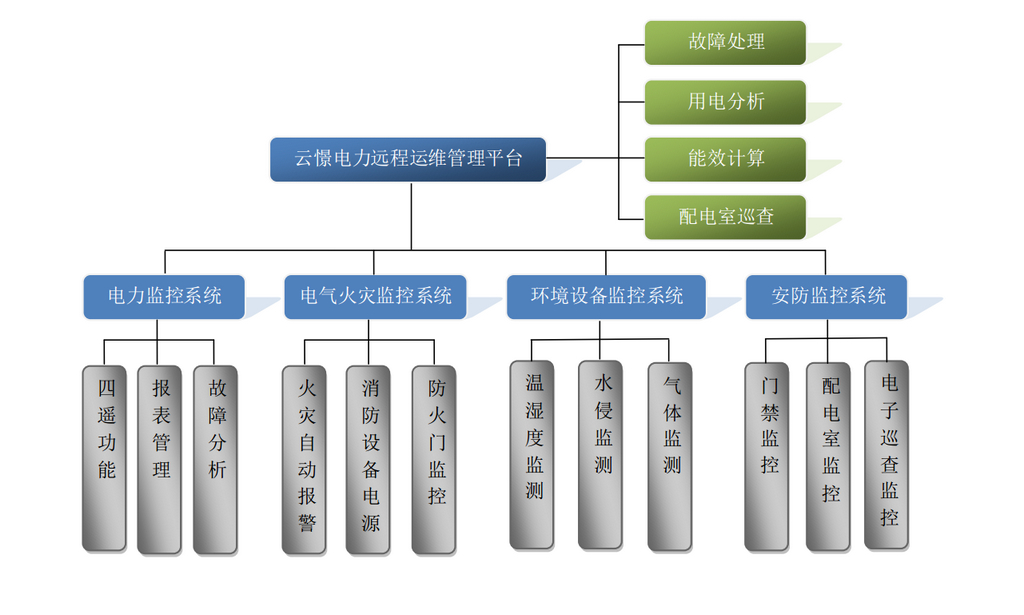 電力遠(yuǎn)程運(yùn)維平臺(tái)主要保障用戶用電安全、可靠、穩(wěn)定為目標(biāo),結(jié)合多年實(shí)際現(xiàn)場(chǎng)運(yùn)維經(jīng)驗(yàn),主要包括用電分析、能效計(jì)算、配電室巡查、故障處理等功能,給用戶提供完善的電力監(jiān)控系統(tǒng)、電氣火災(zāi)監(jiān)控系統(tǒng)、環(huán)境設(shè)備監(jiān)控系統(tǒng)、安防監(jiān)控系統(tǒng)等解決方案。