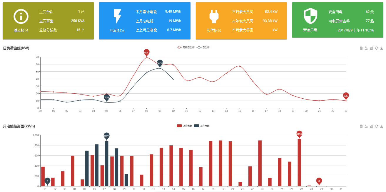 每個(gè)站點(diǎn)的用電狀況,站點(diǎn)的變壓器容量、電能數(shù)據(jù)、最大負(fù)荷及需量、安全運(yùn)行及告警顯示,快速了解站點(diǎn)用電狀況,也可對(duì)比同期用電,直觀體現(xiàn)用電趨勢(shì)。