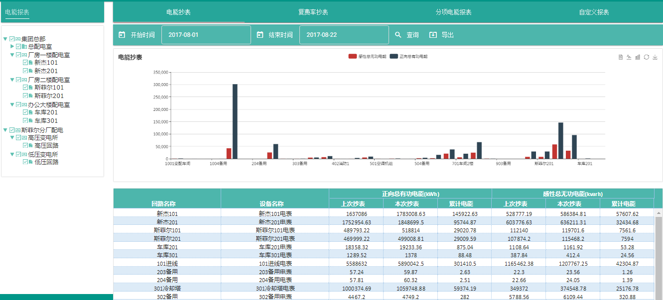 對(duì)各回路運(yùn)行數(shù)據(jù)統(tǒng)計(jì),實(shí)時(shí)數(shù)據(jù)可用EXCEL格式導(dǎo)出,可提供歷史數(shù)據(jù)報(bào)表,電能分項(xiàng)報(bào)表,電能質(zhì)量報(bào)表,日?qǐng)?bào)表、月報(bào)表、季報(bào)表、年報(bào)表等,同時(shí)系統(tǒng)可生成如折線圖、柱狀圖等,直觀反映系統(tǒng)運(yùn)行情況,滿足用戶不同需求,為后期節(jié)能改造服務(wù)提供基礎(chǔ)數(shù)據(jù)。