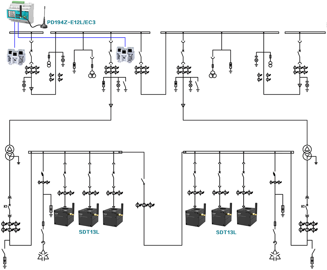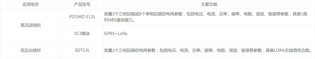 本方案高壓采用PD194Z-E12/EC3多回路儀表可同時監測兩路高壓主備進線,電壓采樣高壓PT柜內二次電壓,電流采樣可取測量CT二次回路,低壓采用SDT13穿刺式安裝儀表,采用LoRa無線透傳方案,可通過GPRS遠傳模塊上傳至企業能耗管理平臺或政府能耗管理平臺等第三方平臺系統。