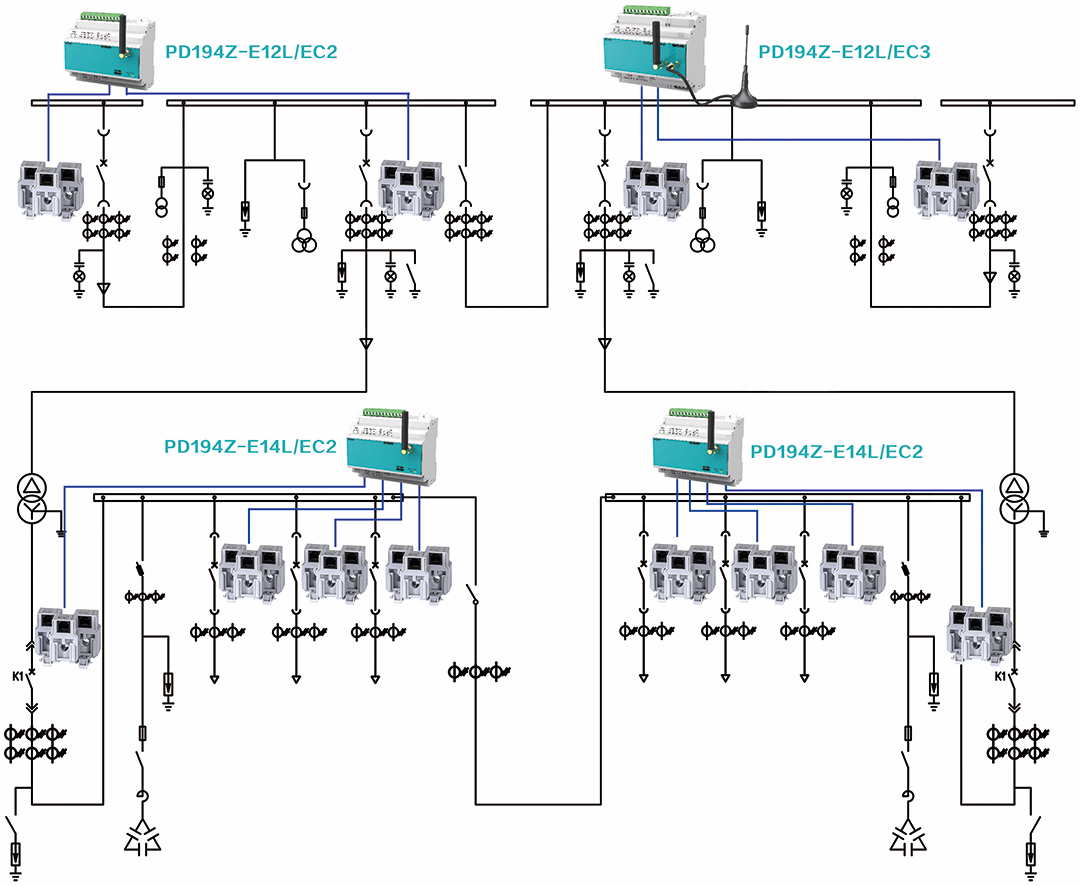 本方案高壓采用PD194Z-E12/EC3多回路儀表可同時監測兩路高壓主備進線,電壓采樣高壓PT柜內二次電壓,電流采樣可取測量CT二次回路,低壓采用PD194Z-E14多回路儀表可同時監測4個三相回路,現場可選配EC2無線透傳模塊,將所有采集電能數據匯總至高壓側,通過GPRS遠傳模塊上傳至企業能耗管理平臺或政府能耗管理平臺等第三方平臺系統。
