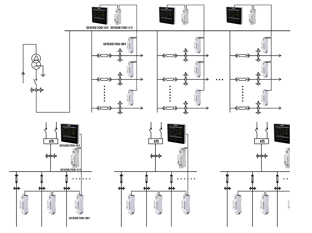 本方案低壓側采用SFERE700分布式多回路儀表,配電柜或配電箱每個回路可安裝SFERE700-M1測量模塊,可通過SFERE700-C1通信模塊及SFERE700-D1顯示模塊實現就地顯示功能。