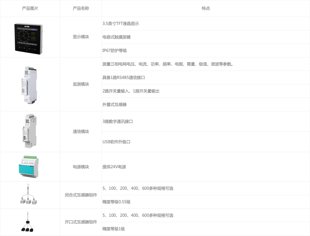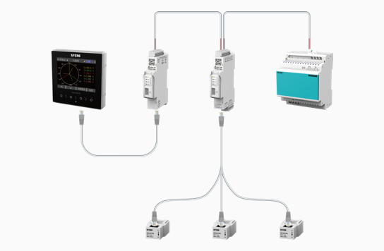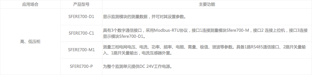 一條總線最多能接入32個SFERE700-M1測量模塊,SFERE700-M1測量模塊采集電量數據,測量模塊可根據客戶現場不同需求選用,也可滿足定制化要求。SFERE700-P電源模塊給整個系統供電,可選配SFERE700-C1通信模塊及SFERE700-D1顯示模塊。